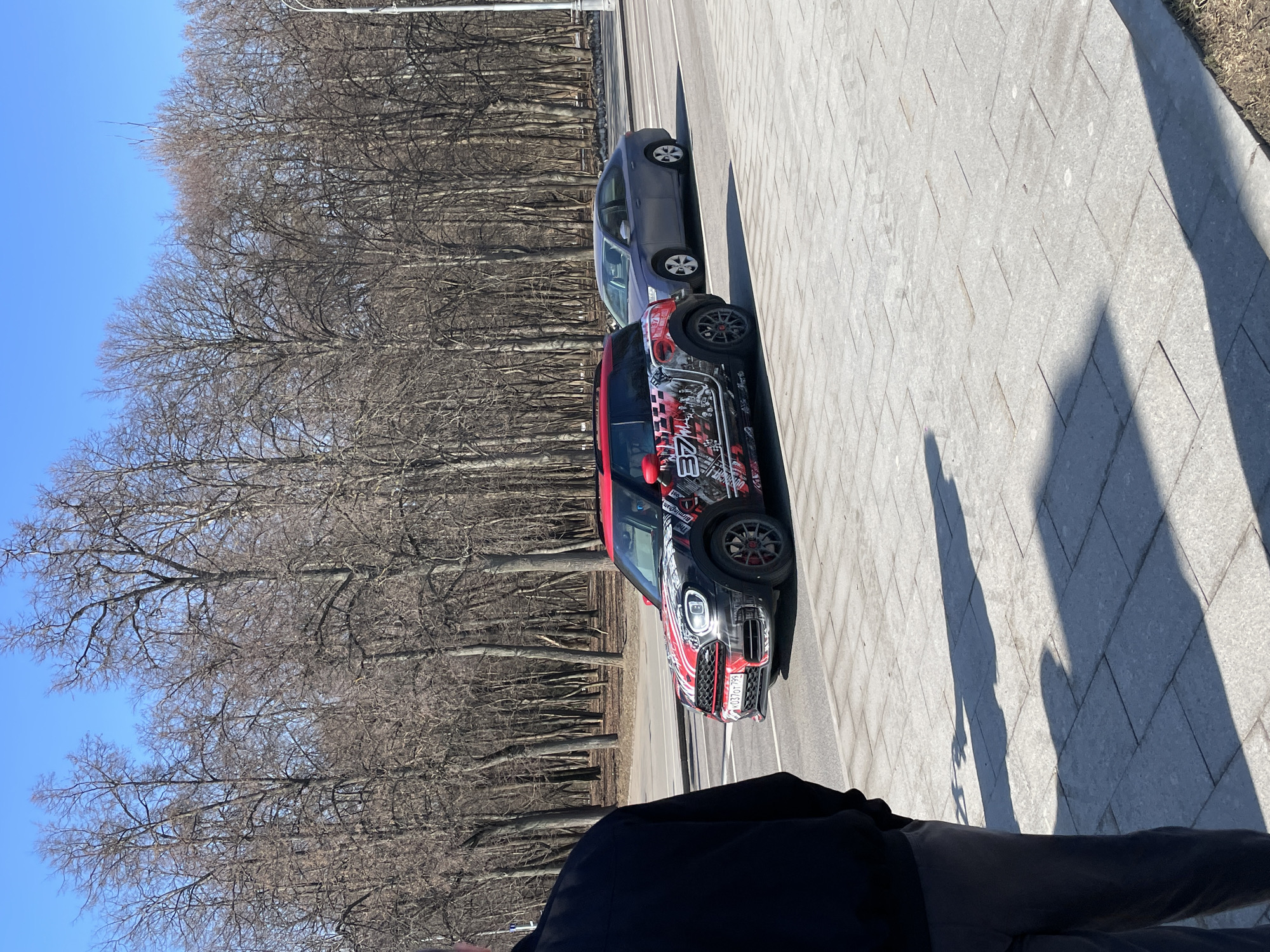 The image depicts a street scene on a sunny day, likely in a park or recreational area in Moscow, Russia. In the foreground, a portion of a person's body is visible, wearing dark clothing. The primary focus is on two parked cars: a decorated Mini Cooper and a navy blue sedan. The vehicles are parked on a paved surface alongside a road. Trees, mostly bare of leaves, line the opposite side of the road, suggesting it might be early spring or late fall. The sky is clear and blue. Shadows are cast on the pavement, adding depth to the scene.