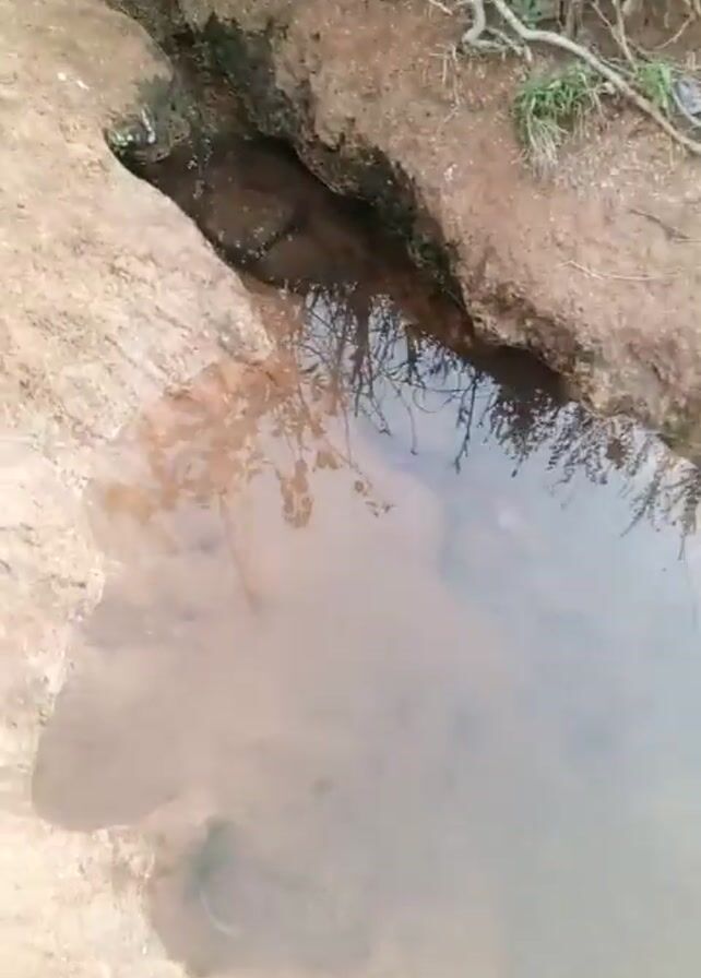small stream of water flowing through a narrow, earthen channel. The channel is bordered by reddish-brown soil and some sparse vegetation. The water is clear and reflects the sky and nearby trees. The camera pans slightly to show the source of the stream, which appears to be a small spring or seep in the bank. The area around the spring is dark and wet, with some decaying leaves and debris.