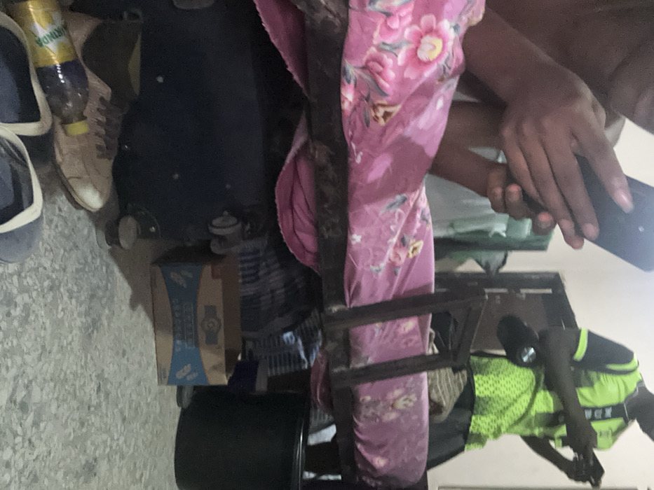 The scene includes shoes, a beverage bottle, a blue suitcase, and a cardboard box. A metal frame supports a floral-patterned pink cloth. Two hands are holding a phone. A person in a green and black shirt is seated nearby, suggesting an indoor setting. The composition and objects convey a sense of everyday life.