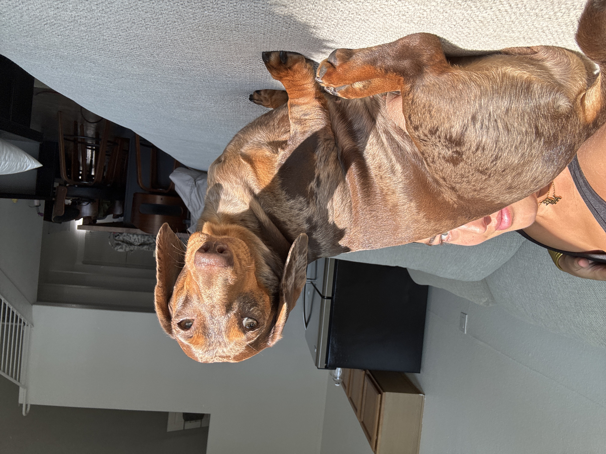 The image depicts an indoor residential scene in San Diego, United States of America. A dapple-patterned dachshund, predominantly reddish-brown with lighter tan and grey patches, is seated upright on a light grey textured sofa, facing directly towards the viewer. Its eyes are open and reflect ambient light. Intense natural sunlight strikes the dog's left flank and the sofa surface, creating distinct highlights and shadows. To the immediate left of the dog, the upper torso and head of a person are partially visible, lying on the sofa. The person wears a dark-colored strap garment and a gold-toned necklace with a geometric pendant. A gold-toned bangle is visible on their left wrist. Their lips appear pink. The background reveals a modern living space with light-colored walls. On the left side of the frame, a dark-colored refrigerator, a silver-toned appliance, and light brown wooden wall cabinets are visible, indicating an adjacent kitchen area. A white light switch is mounted on the wall above the sofa. On the right side of the background, a white staircase with white railings ascends, suggesting a multi-level dwelling. Below the staircase, a dark counter or table with several dark wooden bar stools is present. A white pillow rests on a dark furniture piece in the far right background.