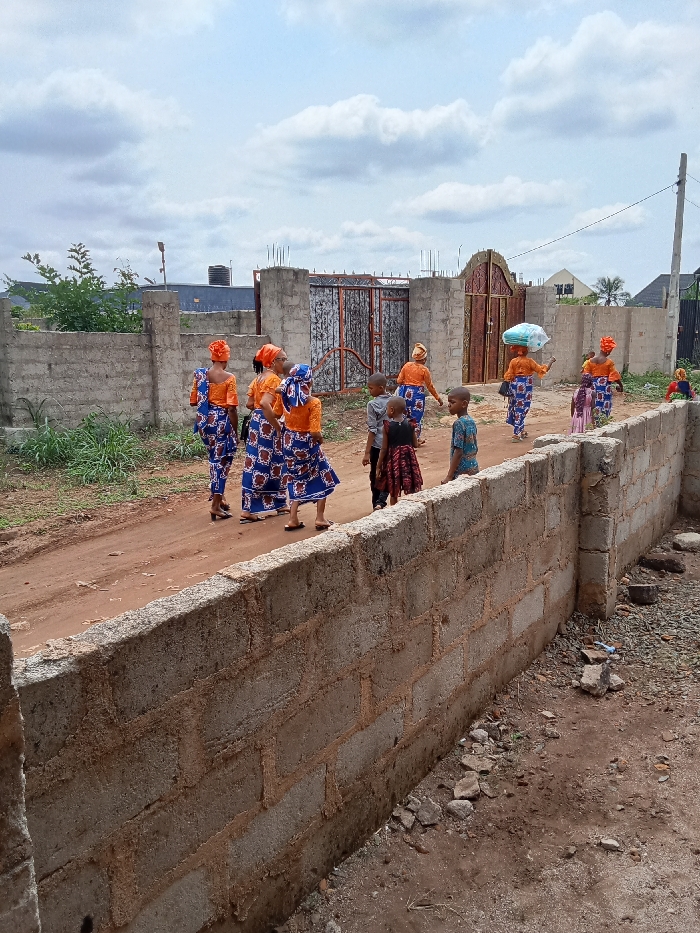 The scene in Orji, Nigeria, depicts an outdoor setting under an overcast sky, observed from a slightly elevated position overlooking a dirt road. In the immediate foreground, a grey concrete block wall, approximately halfway constructed, extends horizontally across the frame. Debris, including small rocks and loose soil, is visible at its base. On the unpaved, reddish-brown dirt road, a group of thirteen individuals is present. This group comprises eight adult females and five children. The adult females are predominantly attired in matching traditional garments, featuring blue and white patterned wraparound skirts or dresses, and solid orange blouses with coordinating head ties. They are distributed along the road, with some clustered together, appearing to walk from the right side of the frame towards the left. One female near the right edge of the road carries a large, white, cloth-wrapped bundle balanced on her head. The children, dressed in casual clothing including t-shirts, shorts, and dresses, are interspersed among the adults, moving or standing. In the background, a more developed concrete block wall with a large, dark, ornate metal gate defines a property entrance. Metal rebar protrudes vertically from the top of this wall. Beyond this background wall, additional residential structures with various roof types are visible under the cloudy sky, alongside a dark elevated water tank. Sparse green vegetation grows along the walls and edges of the dirt road. A utility pole with overhead wires is visible on the far right.