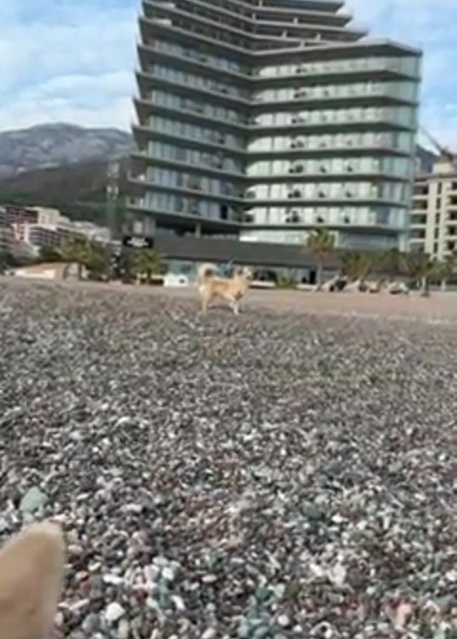 pebble beach with a modern, curved skyscraper in the background. A light-colored chihuahua runs toward the camera and the person filming, who is crouched down with a brown chihuahua. The person calls the light-colored chihuahua towards them, then pets it.