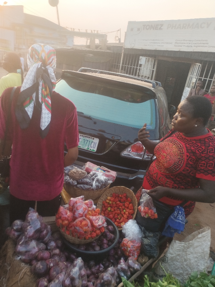 A street market scene with a woman in a red patterned shirt selling produce from baskets and bags. Onions and various types of peppers are visible. A customer in a maroon shirt with a head scarf stands near her stall. A black SUV with a license plate reading "ANAMBRA FE-371CU" is parked close by. A pharmacy named "Tonez Pharmacy" is visible in the background along with several bystanders. The lighting is hazy, suggesting early morning or late afternoon.