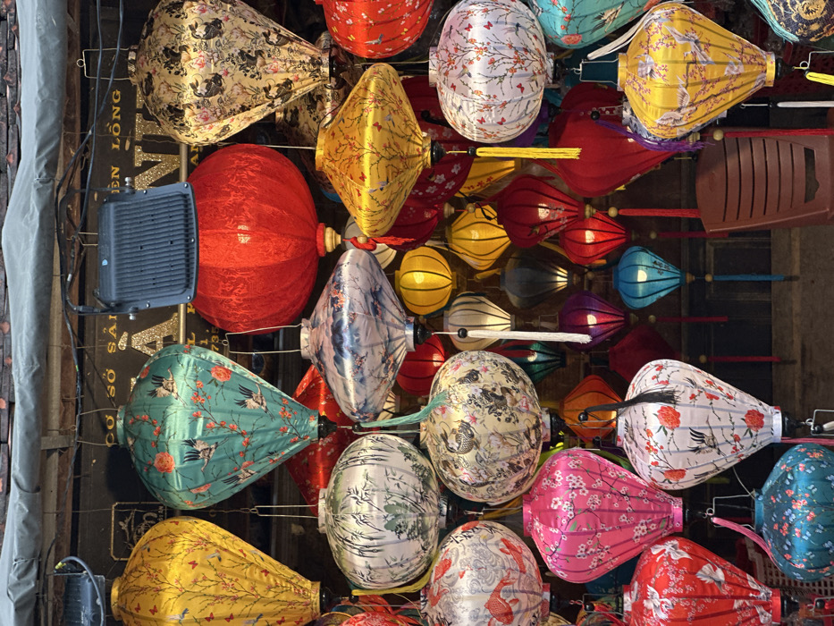 The image captures a dense display of numerous traditional Vietnamese silk lanterns in a commercial setting within Hội An Ward, Vietnam