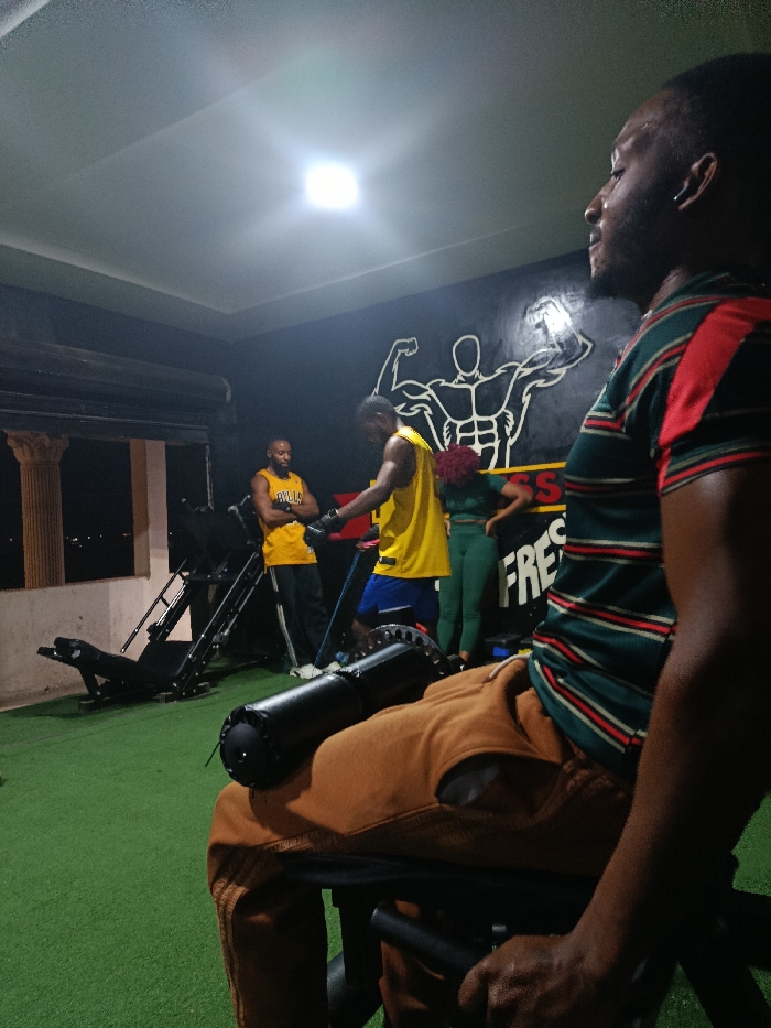 The image depicts an indoor fitness facility, reportedly located in Kabong, Nigeria, during evening hours