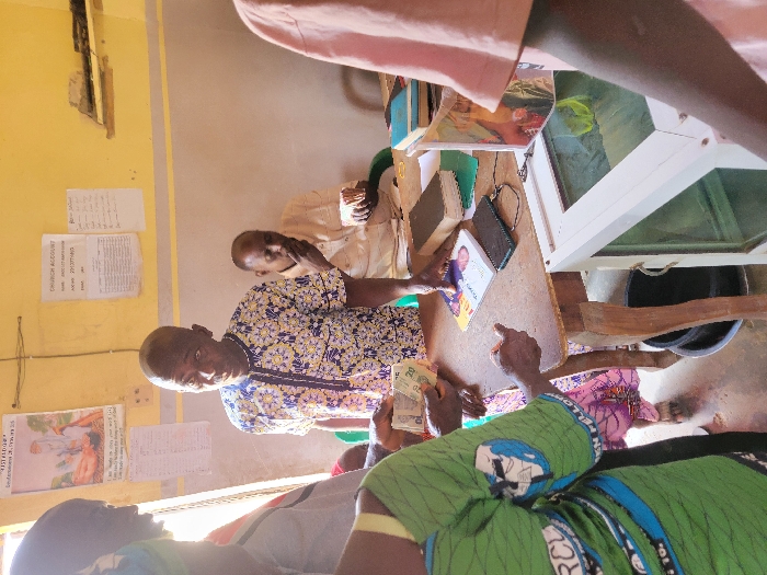 The scene depicts an indoor administrative or communal space in Kwamba, Nigeria