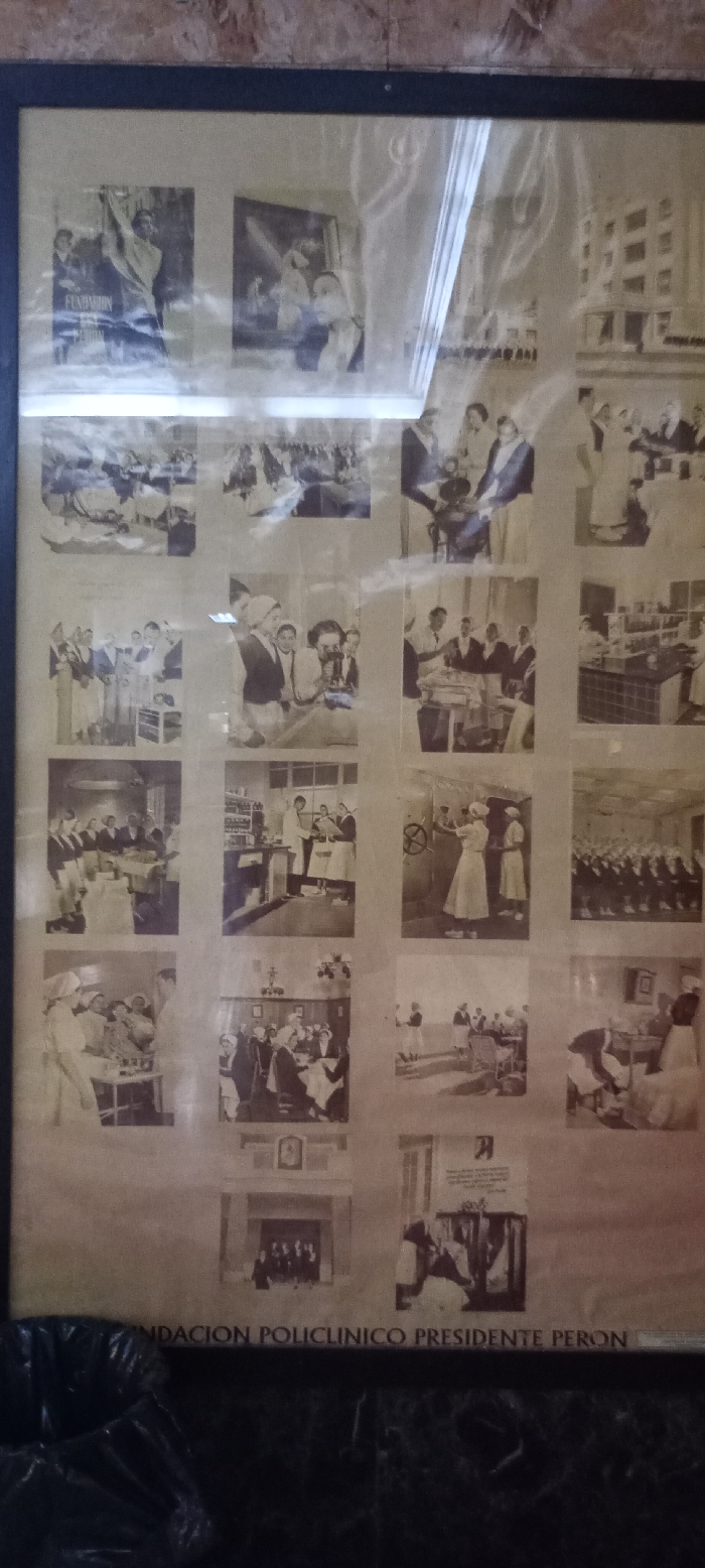 A framed collage of black and white photographs documents the Fundación Policlínico Presidente Perón