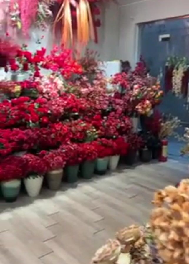 interior of a flower shop or showroom. Rows of potted flowers in various colors, predominantly red, orange, and purple, are displayed along the wall. The floors are light-colored wood-look planks. Decorations and hanging flowers adorn the walls and ceiling. A glass door leading outside is visible on the right side of the video. The scene appears to be well-lit.