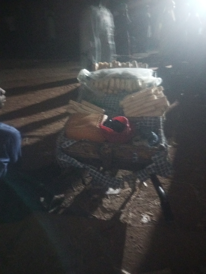 A dimly lit outdoor scene shows a table covered in a patterned cloth. The table supports various items, including packaged goods, bundles of sticks, and a red container with a dark interior. The surroundings are dark, with shadows cast by the table and nearby figures, one of whom is partially visible on the left. The lighting is poor and grainy, highlighting the table's contents.
