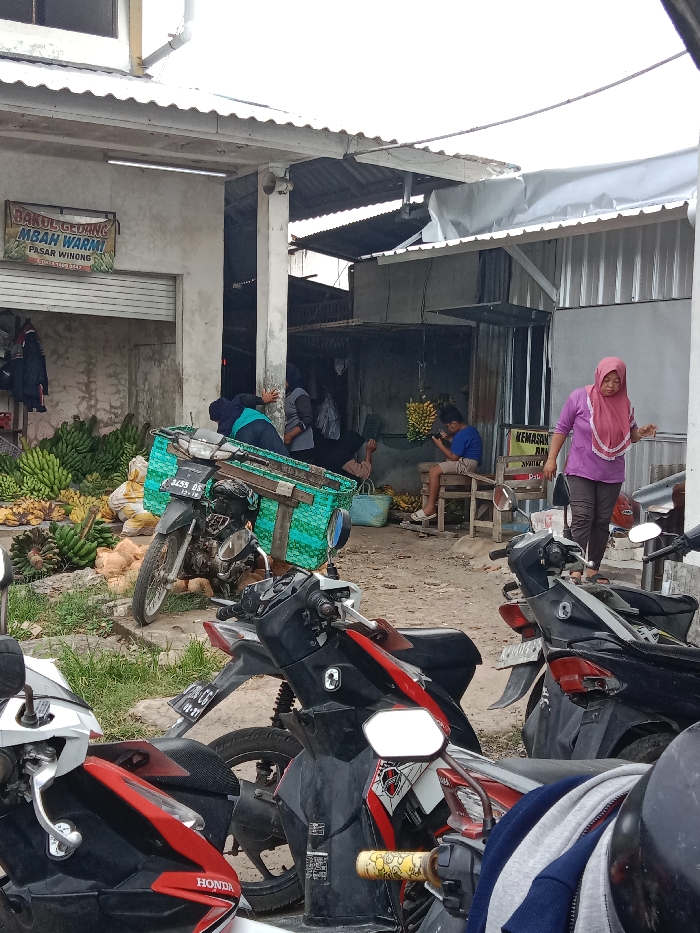 A bustling outdoor market scene features several motorcycles parked in the foreground. Bananas are piled near a building with a sign that reads "Bakul Gedang Mbah Warmi Pasar Winong." Several people mill about, one wearing a pink hijab, another seated and using a mobile device. A motorcycle with a large, green basket is laden with goods. The scene suggests a vibrant local marketplace with a focus on the trade of bananas.