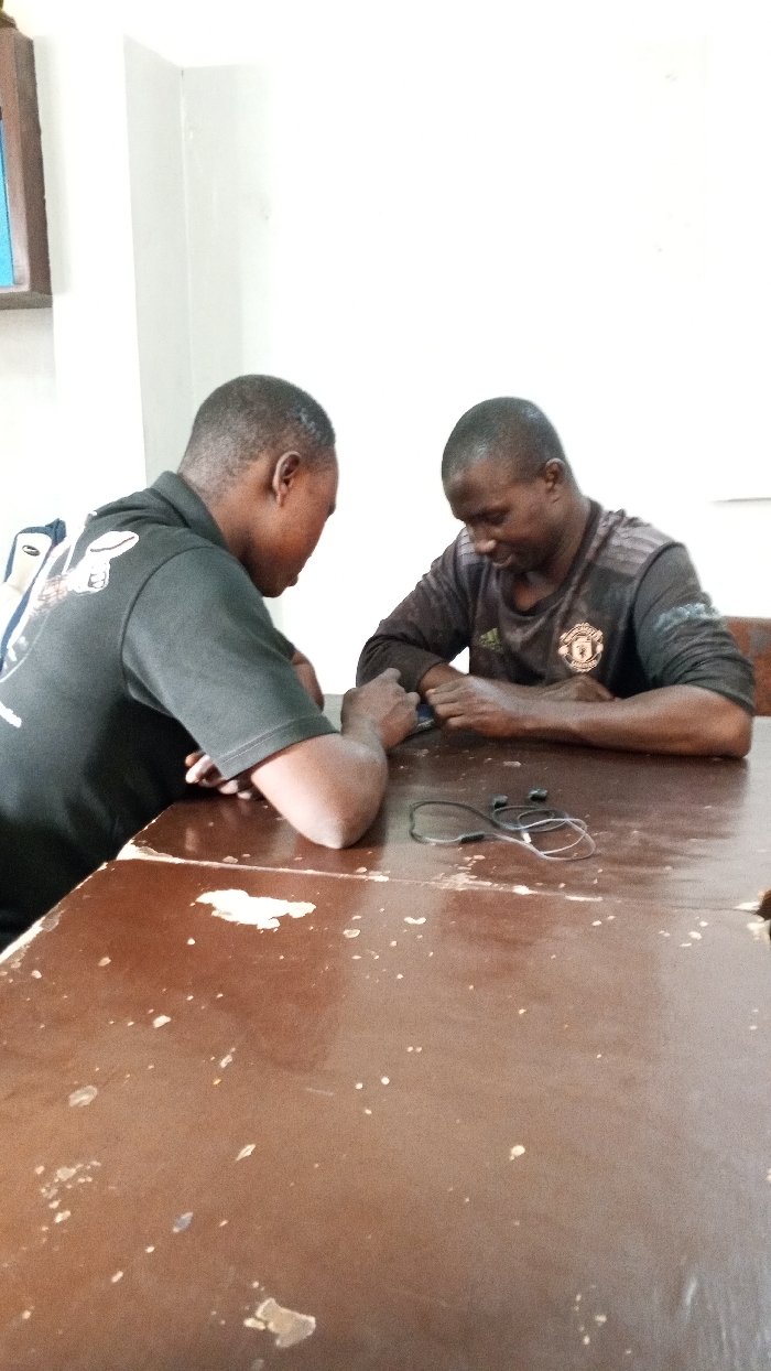 The image displays two adult males seated at a worn, dark brown wooden table in an indoor setting. The specific location within the city of Dakata, Nigeria, is not discernible from the visual evidence. The individual on the left, with short dark hair, wears a dark short-sleeved shirt with a white design partially visible on the upper back. He is leaning forward, elbows on the table, and appears to be manipulating a dark-colored smartphone with his left hand. The individual on the right, also with short dark hair, wears a dark long-sleeved shirt with an Adidas logo and a Manchester United crest on the chest. He is also leaning forward, hands on the table, seemingly interacting with a dark-colored smartphone. A tangled pair of black wired earphones rests on the table between the two men. The background features a plain white wall, with a partial view of a wooden frame containing a blue element in the upper left corner.