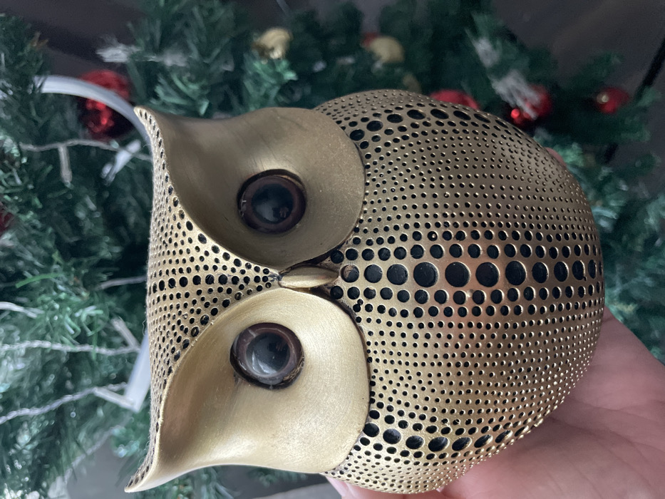 A metallic, brass-toned owl figurine, approximately 15-20 cm in height, is centrally depicted, held in the fingers of a human hand