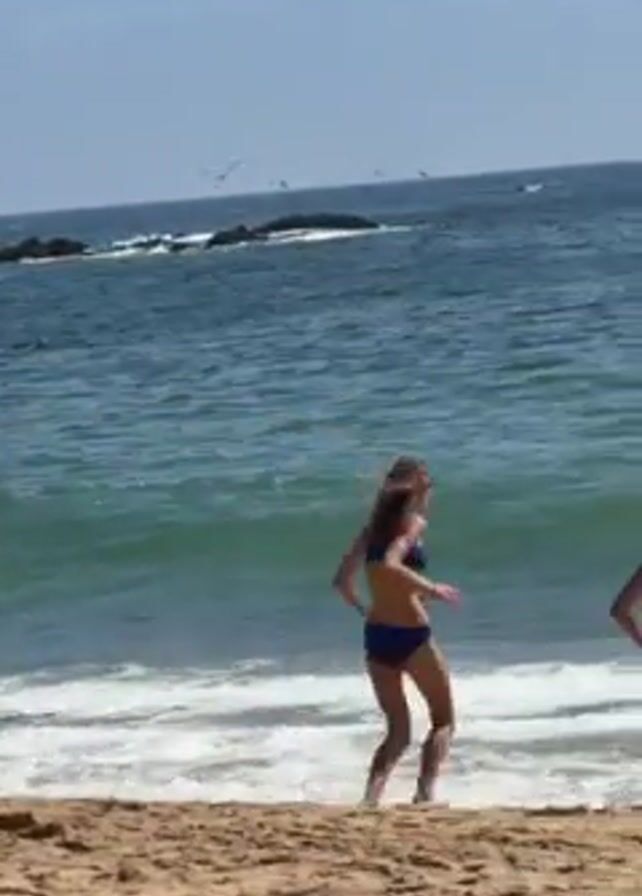 A young woman in a blue bikini runs along a sandy beach towards the ocean. A young man in green swim trunks approaches and they both run into the water. There are rocks visible in the ocean. Several birds fly in the sky.