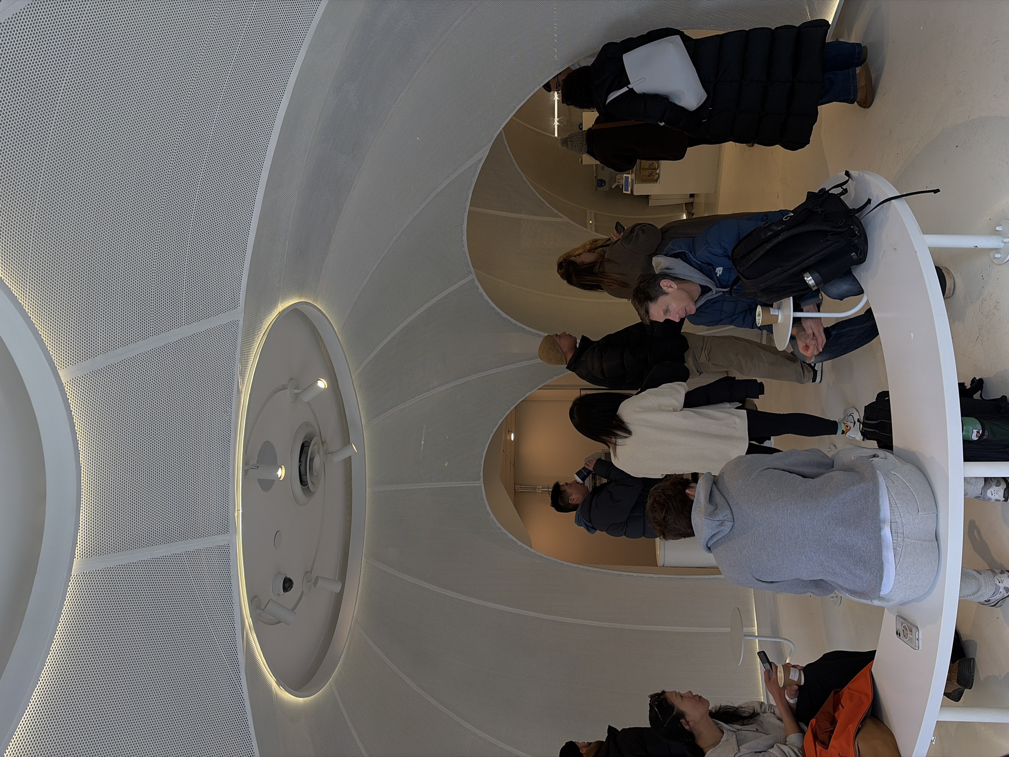 The photograph captures an indoor scene in what appears to be a restaurant or cafeteria. The location is noted as Whistler, Canada. Patrons are seated around a circular table, some appearing to be eating or drinking. Clothing observed include winter coats, hoodies, and casual wear. A backpack sits on the table. The building features a unique architectural design of perforated white panels creating a domed ceiling with recessed lighting.