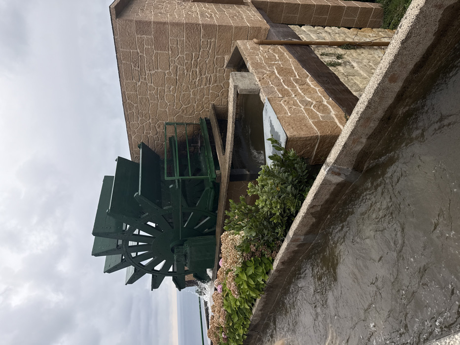 - "A large, active dark green water wheel, positioned at the top of a multi-tiered brown stone-patterned structure, dominates the scene" by FM-PDjLC3, licensed under CC BY 4.0
