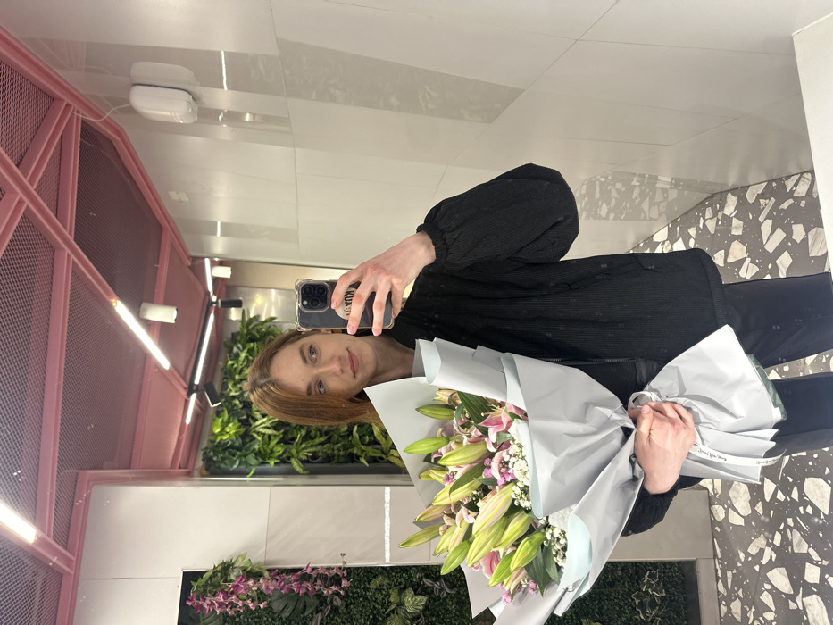 The image depicts a female individual captured in a mirror selfie within an indoor setting identified as Yiwu, China, based on text visible on her phone case. The individual has reddish-brown hair and is dressed in a dark, possibly black, ribbed jacket featuring puffed sleeves and dark trousers. She holds a transparent-cased smartphone in her right hand, actively capturing her reflection. Her left hand supports a large bouquet of flowers, predominantly consisting of pink lilies, many in various stages of budding, interspersed with smaller white and pink filler flowers and green foliage. The bouquet is wrapped in layers of light grey paper with an inner light blue layer, secured by a white ribbon printed with text. The environment reflected in the mirror features a modern aesthetic. The ceiling is a striking pink open-grid metal structure equipped with linear and recessed lighting fixtures. The walls are clad in glossy white tiles. The floor is a terrazzo-style surface with a dark grey base and embedded light grey and white chips. To the left, a vertical garden or living wall displays a variety of green plants and cascading purple artificial flowers. A white, two-segment wall-mounted object, possibly an air freshener or similar device, is visible on the right wall, with a thin white wire extending above it. No other individuals are present.