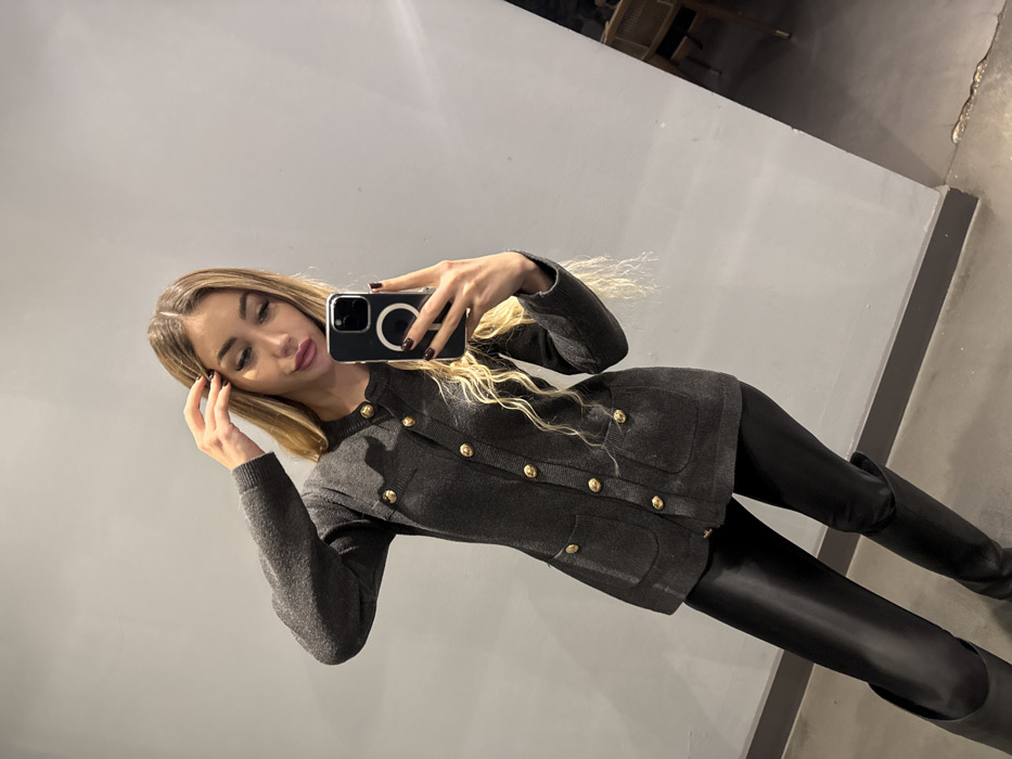 A female subject is depicted in an indoor mirror selfie. The specific location within Berlin, Germany, cannot be determined from the visual information provided. The subject, with long blonde hair, stands facing a large, light gray reflective surface. She holds a black smartphone, equipped with a white circular MagSafe accessory on its rear, in her right hand to capture the image. Her left hand is positioned near her left temple, touching her hair. She is wearing a dark gray, long-sleeved cardigan-style top featuring gold-colored buttons on the front closure and on four decorative pockets. Her lower body is clad in black, form-fitting trousers or leggings, and black knee-high boots. The floor visible in the foreground is a medium gray concrete or tiled surface. In the background reflection to the right, indistinct dark shapes suggest additional room furnishings.