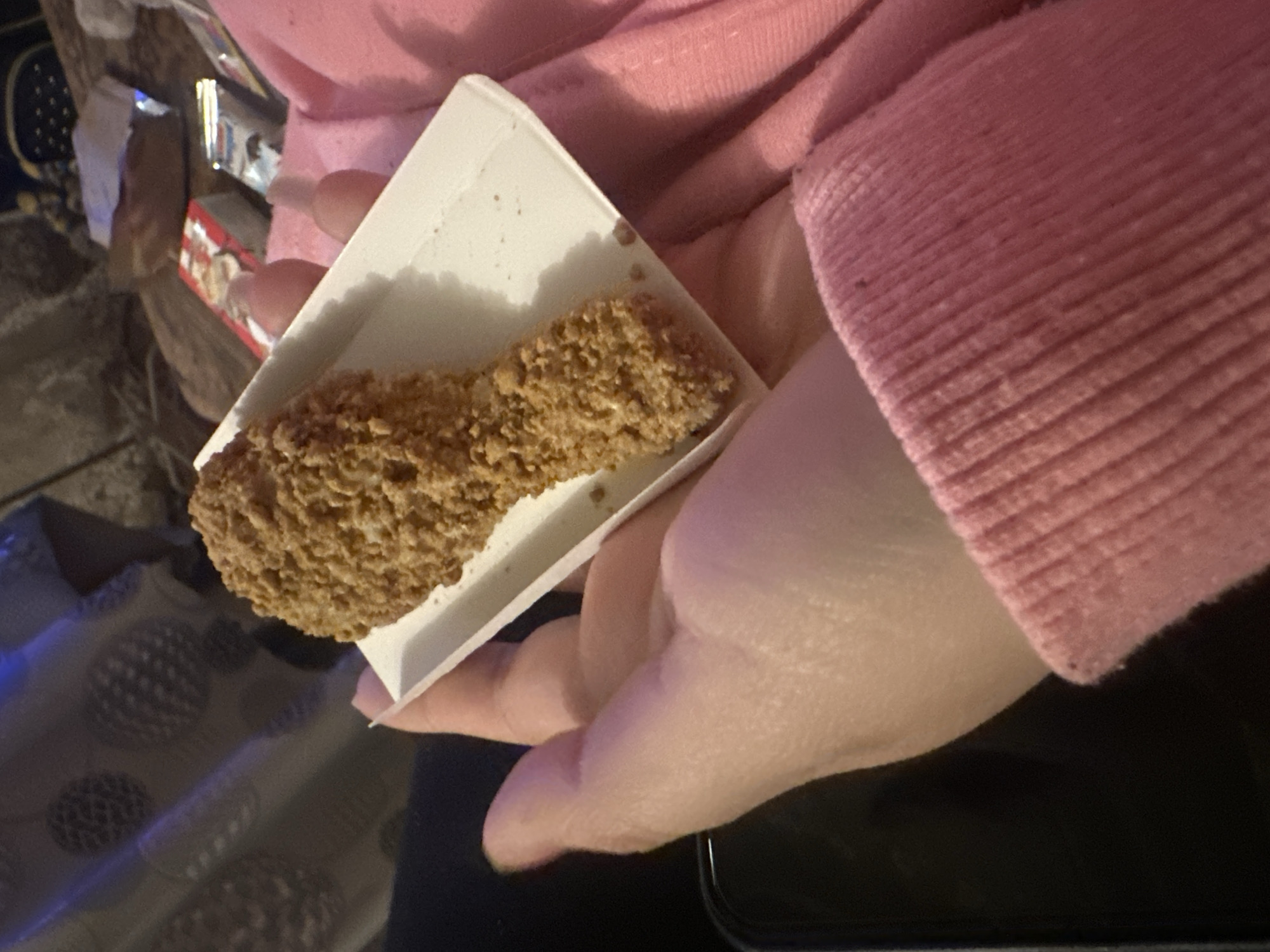A person wearing a pink sweater is holding a white cardboard container containing a fried chicken tender. The location is unknown.