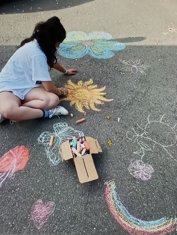 A young adult female is depicted kneeling on a dark asphalt surface, engaged in creating chalk art
