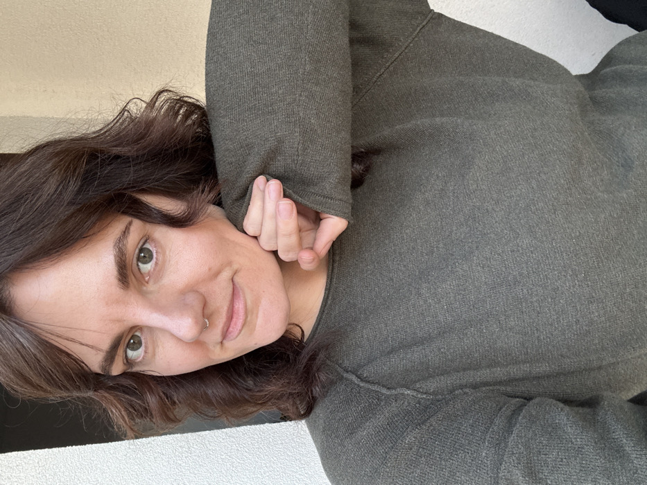 An individual, identified as female, is depicted in a close-up portrait, oriented slightly to the left of the frame. She has medium-length, wavy, dark brown hair with bangs, light green eyes, and a small, silver-colored hoop piercing in her left nostril. Her skin is fair, exhibiting minor natural texture. She displays a slight, closed-mouth smile while looking directly at the camera. She is wearing a dark olive green, long-sleeved knitted sweater with raglan sleeve stitching. Her right hand is raised to the side of her face, with fingers curled and resting against her jawline, partially obscured by the sweater's sleeve. The background consists of a plain, light-colored wall on the left and a plain, light beige wall on the right, both out of focus. The scene is located in Boreti, Montenegro.