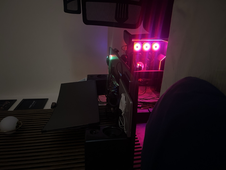 A dimly lit room displays a gaming setup. A large curved monitor and speakers sit on a striped desk. A computer tower with pink LED lights and fans glows brightly in the background. Various cables snake across the floor. Part of a chair is visible above the desk, and a dark object obscures the right side of the view, possibly someone sitting nearby. Framed pictures decorate the wall behind the desk.