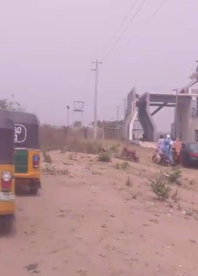 dusty, open area in front of a building with a large entrance gate, where a crowd of people has gathered
