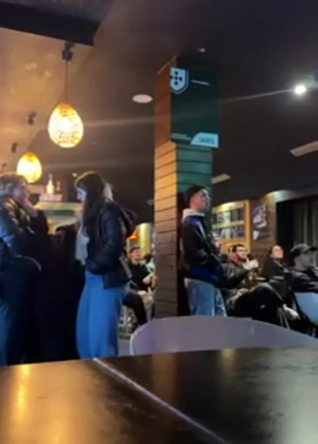 group of people gathered in what appears to be a bar or pub, watching a game or event on a screen