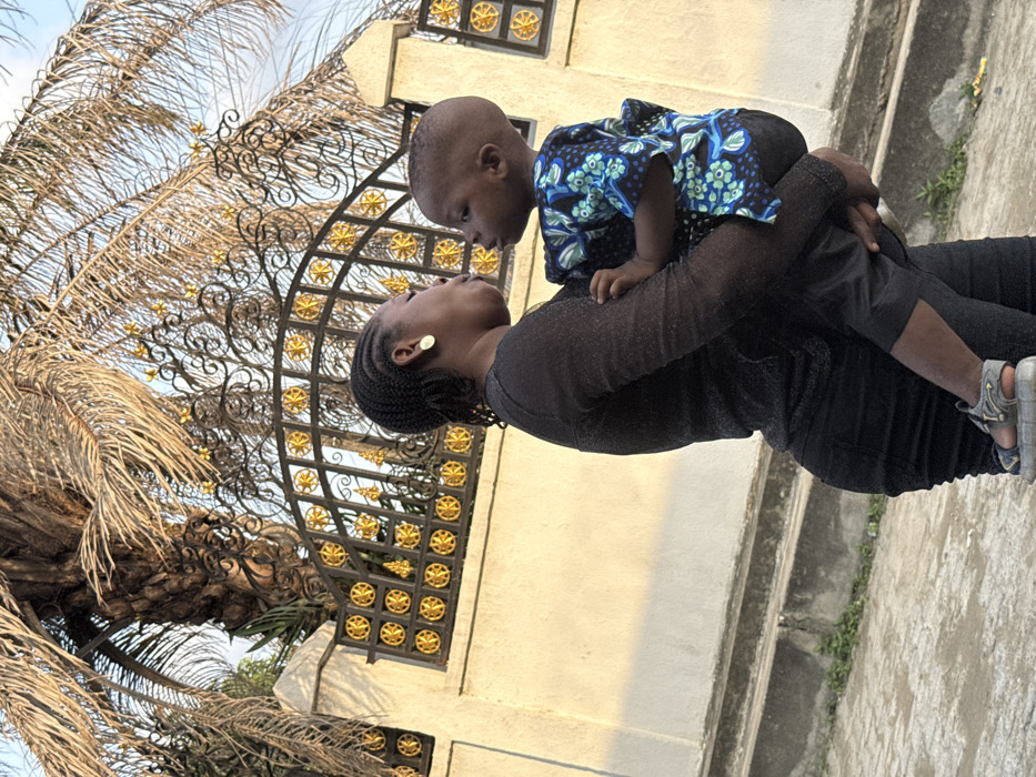 A woman in a shimmering black top and pants holds a young child wearing a blue patterned shirt and dark pants. They face each other, their faces close as if about to kiss. In the background, a beige building with a black and gold decorative gate is visible. A palm tree with dry fronds is to the left, contrasting with the clear sky. The photo captures a tender moment between mother and child, emphasizing their connection.