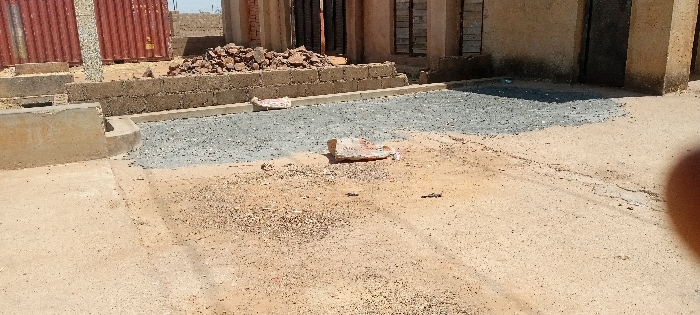 The image depicts an outdoor construction or demolition site in the city of Unknown, Unknown, under bright, clear daylight. The foreground is a light brown earthen surface interspersed with dark gravel and small debris. A blurred, dark, organic object, consistent with a human digit, partially obstructs the lower right corner. The midground features a rectangular area of light grey crushed stone or gravel, upon which two fragmented, irregular pieces of light-colored concrete or stone are situated. The background comprises a low retaining wall constructed from light brown concrete blocks, topped by a mound of reddish-brown rubble. To the left, a segment of a reddish-brown corrugated metal shipping container is visible. To the right and center-background, incomplete structures composed of light brown concrete blocks, displaying exposed frames or doorways, are present. The sky above is devoid of clouds and appears light blue. No people or actions are visible.