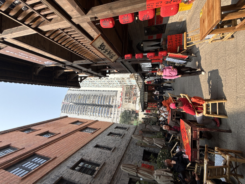 A street scene with traditional Chinese architecture contrasts with a modern building in the background