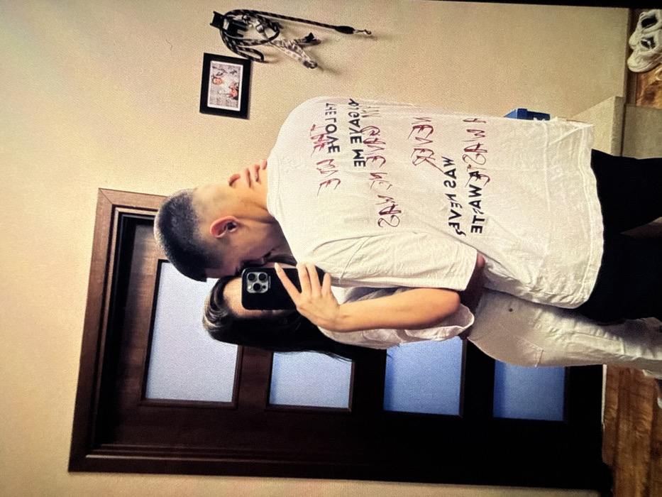The image depicts two individuals reflected in a mirror within an indoor setting, consistent with a private residence in the city of Cherven Bryag, Bulgaria. A female, positioned on the left, has her face largely obscured by a dark-colored smartphone held in her left hand, which is angled to capture the reflection. She has dark hair and wears a light-colored short-sleeved top and light-colored trousers. Her right arm is wrapped around the neck/shoulder of the male. The male, positioned on the right with his back partially to the viewer, has a short fade haircut and wears a white oversized t-shirt with stylized black and red text on the back, reading "THE LOVE YOU GAVE ME WAS NEVER A WASTE" (mirrored). He wears dark trousers. His left arm is around the female's waist. The two individuals are embracing. In the background reflection, a dark brown wooden door with two frosted glass panels is visible on the left. The light-colored wall features a small framed picture of two individuals and a hanging patterned strap or belt. A light-colored surface, possibly a shelf, is beneath these items, and a pair of white athletic shoes rests on the floor in the bottom right.