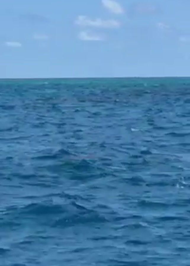 open ocean on a clear day with some wispy clouds in a light blue sky. The water is a deeper shade of blue and has small ripples or waves. At 0:01, a sea turtle surfaces in the water. It surfaces again at 0:03, and then disappears from view.