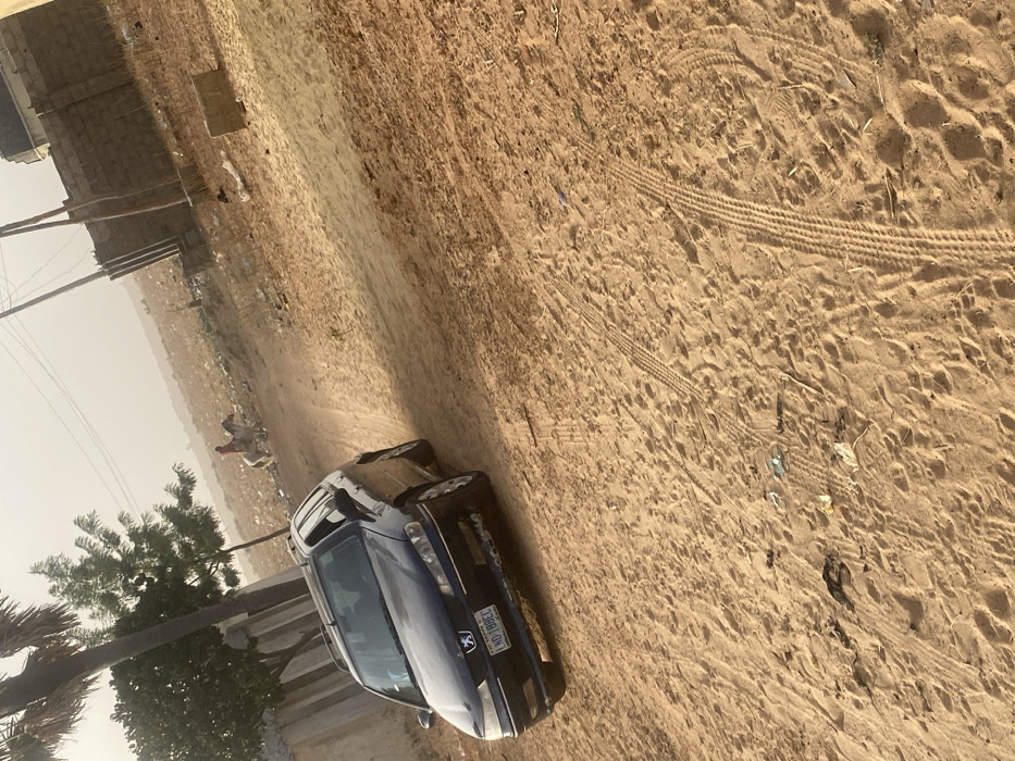 A blue car is parked on a sandy road next to a building and a palm tree. Tire tracks mark the sand, and some scattered trash is visible. In the distance, a person in a red garment is walking or riding an animal. The sky is hazy.