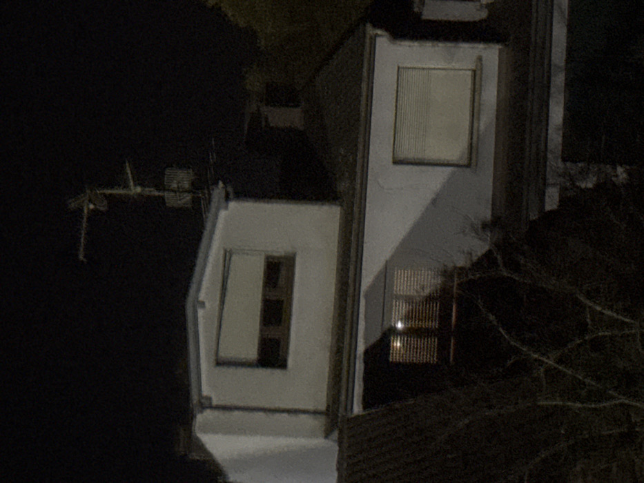 The image depicts an exterior nighttime scene in Bischheim, France, showcasing architectural elements of residential structures. In the upper portion, a white-walled dormer features a window with a light-colored roller shutter partially lowered, revealing three dark, rectangular window panes beneath it. A multi-element antenna is mounted on a roof behind and above this dormer, extending upwards into the dark sky. Below, a second white-walled building is partially visible. Its left window is illuminated from within, displaying horizontal blinds. A distinct diagonal shadow from an unseen object falls across the wall to the right of this illuminated window. The right window on this lower building is completely covered by a light-colored roller shutter. The foreground contains dark, bare tree branches and a section of a dark, tiled roof, partially obscuring the lower structures. No individuals are present in the scene.