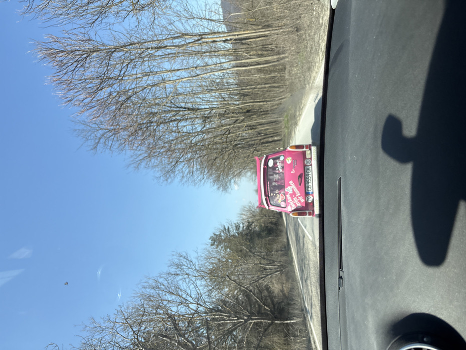 The image displays a bright pink two-door hatchback vehicle, identified by its style as a potential Trabant, in motion on an asphalt road in the city of Balgarene, Bulgaria. The scene is observed from the interior of a trailing vehicle, with its dashboard visible in the immediate foreground, featuring a circular air vent on the left and a prominent shadow cast across the right. The pink vehicle is customized with a matching pink rear spoiler and multiple stickers affixed to its rear window, including a large banner stating "zwickau - berlin - wir kommen!" in German. The Bulgarian license plate reads CB 9559 CK 90, and a circular '70' sticker is visible below it. The road is a single lane in this direction, flanked on both sides by dense, bare deciduous trees, suggesting a late winter or early spring environmental setting. The sky is clear and blue, with a small, dark bird in flight in the upper left portion of the frame. No individuals are explicitly visible.