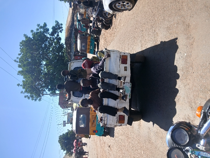 The image captures a daytime street scene in Jos, Nigeria, from the perspective of a motorcycle rider, whose handlebars and gauges are visible in the foreground. A white, light-duty pickup truck, driving away from the camera, occupies the midground. Six young males are present in the truck's open cargo bed. Four are seated on the tailgate, facing away, with their legs extended downwards: one on the far left in dark clothing and a dark cap; one in a black t-shirt with white text and dark pants; one in a dark long-sleeve shirt and grey pants; and one on the far right wearing a purple/maroon knitted beanie and dark clothing. Two additional males stand closer to the truck's cab. The truck displays a partially visible green and white license plate and casts a dark shadow onto the dusty road. To the left of the truck, a yellow and blue motorized tricycle (Keke Napep) is visible, followed by pedestrians, some utilizing red umbrellas, indicating a potential market or commercial area. Overhead, power lines extend across a clear blue sky. A large green tree stands prominently on the left. To the right, multiple other motorized tricycles in various colors (green, blue, yellow) are parked, alongside a line of motorcycles or similar small vehicles. A section of a white car is visible on the far right. The road surface is predominantly light-colored dirt or gravel, with scattered darker patches.