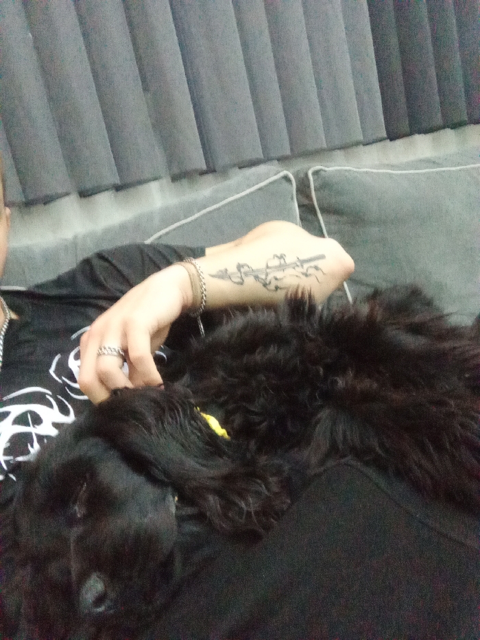 In an interior setting within the city of Vetren Dol, Bulgaria, a person and a black dog are depicted. The person's upper torso, left arm, and hand are visible on the left side of the frame. The individual wears a black short-sleeved shirt with white graphic elements, a silver-colored chain necklace, a light-colored bracelet, and a silver-colored chain-link ring on the left ring finger. A prominent tattoo, appearing to be a stylized weapon or object with flowing elements, is visible on the person's left forearm. The left hand is positioned near the dog's head. The dog, characterized by black, fluffy fur, rests on or against the person's lap or chest. Its head is visible in the lower-left quadrant, with its eyes closed, suggesting it is sleeping or resting. A patch of yellow material, possibly a collar or tag, is visible beneath its ear. The immediate background includes a grey sofa or cushioned furniture with distinct piping. Behind this furniture, grey vertical blinds are visible, suggesting a window or glass door. The overall scene indicates a relaxed indoor interaction between the person and the dog.