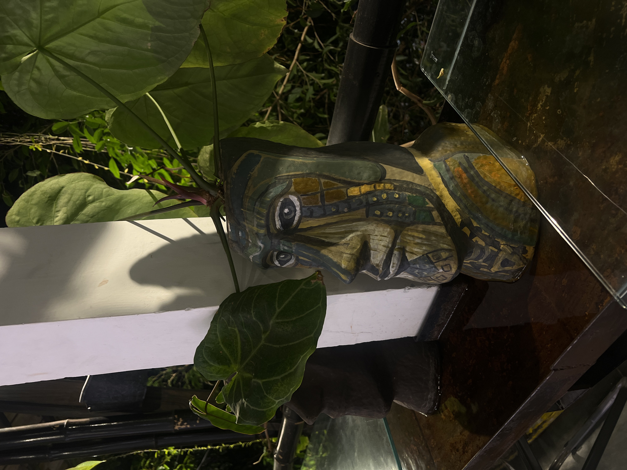 The image features a carved wooden head, possibly Mayan or Aztec in style, situated outdoors amidst vegetation. The head rests on a white ledge and is surrounded by large green leaves of a plant. There is a water feature with dark water visible to the right. The background consists of greenery, suggesting a garden setting. Based on the prompt context provided, it can be inferred that the location is Nha Trang, Vietnam, though there are no definitive visual cues to confirm this. The scene is dimly lit, possibly at night.