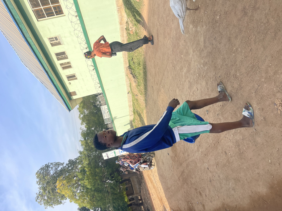 Two men stand outside a light green building with white windows and barbed wire. One man wears a printed orange shirt and dark pants. The other man, closer to the camera, wears a dark blue and white long-sleeved shirt with green shorts. Both men wear sandals. A white bird stands near the man in the orange shirt. A motorcycle is parked in the background near trees.