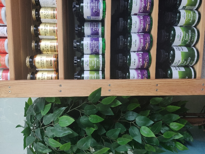 The image displays shelves filled with various supplements and medications