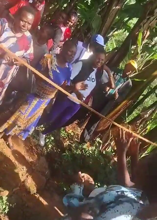 A group of people are standing around what appears to be a ditch. The crowd is diverse in age and clothing, and they are holding onto a rope that extends down into the ditch. It looks like they are pulling something up from the ditch, as several individuals are straining and smiling. Lush green vegetation surrounds the scene. The atmosphere seems celebratory, with visible expressions of joy and relief among the participants.