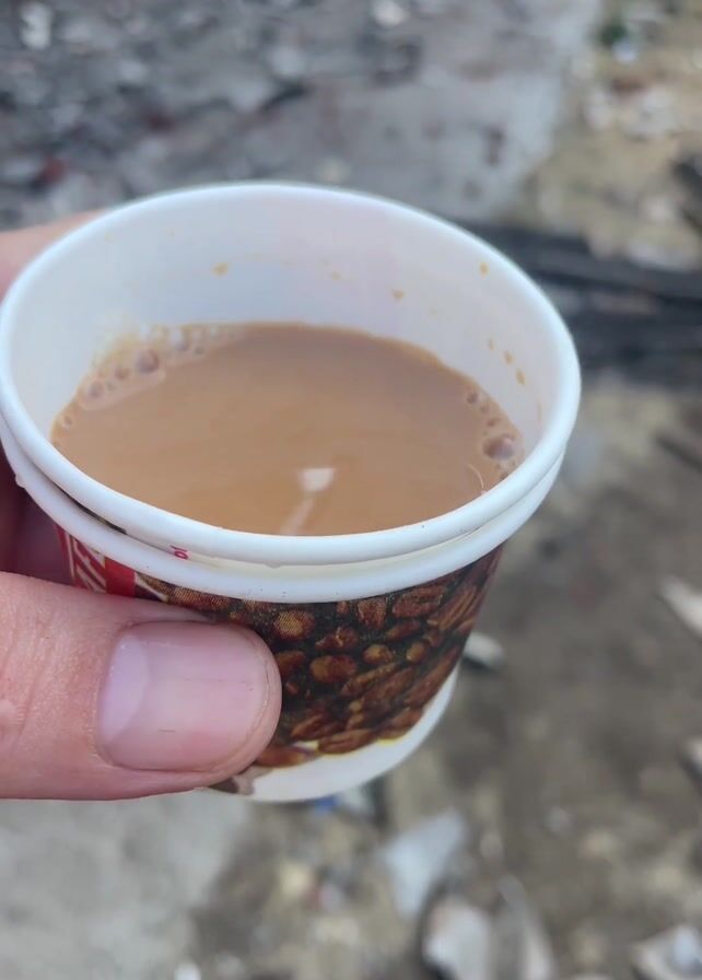 A hand holds a small paper cup of tea. The tea is light brown with small bubbles on the surface. The cup has a white rim and a brown pattern around the outside. The background is a cluttered courtyard with broken debris strewn about, including pieces of wood and stone. A brick wall surrounds the courtyard, and a building with barred windows is visible. The overall scene suggests a neglected or abandoned space.