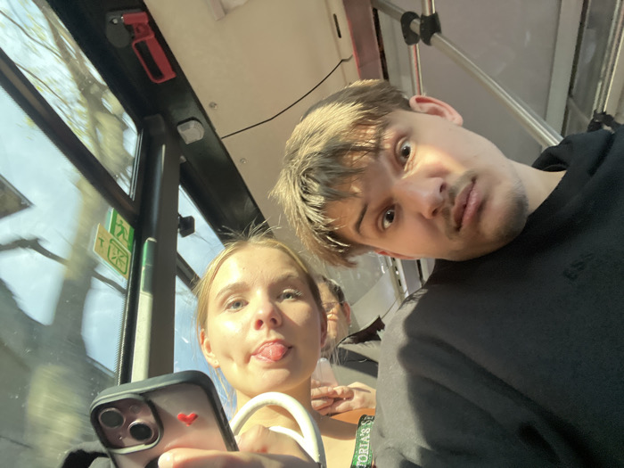 Two young adults, a female and a male, are depicted in a selfie taken inside a public transport vehicle, likely a bus or trolleybus, in the city of Bratislava, Slovakia