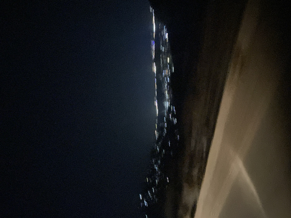The image captures a blurred nighttime panoramic view of the city of Al-Hama, Syria, from an elevated perspective. The scene is characterized by significant motion blur, suggesting it was taken from a moving vehicle or with a slow shutter speed. In the foreground, occupying the lower left quadrant, is an indistinct, light-colored surface, possibly a road or a vehicle's interior component, illuminated by an unseen light source. The midground consists of a dark, unlit expanse, likely natural terrain such as hills or undeveloped land, separating the viewer from the distant urban area. The background prominently features the city lights, appearing as numerous horizontally stretched streaks of illumination across the horizon. These lights are predominantly white and yellow, with occasional blue and purple hues, indicative of streetlights, buildings, and other urban infrastructure. The distribution of these lights suggests a sprawling city. The sky above the cityscape is dark, consistent with nighttime conditions and urban light pollution. No individuals, distinct vehicles, or specific architectural details are discernible due to the low light and motion blur.