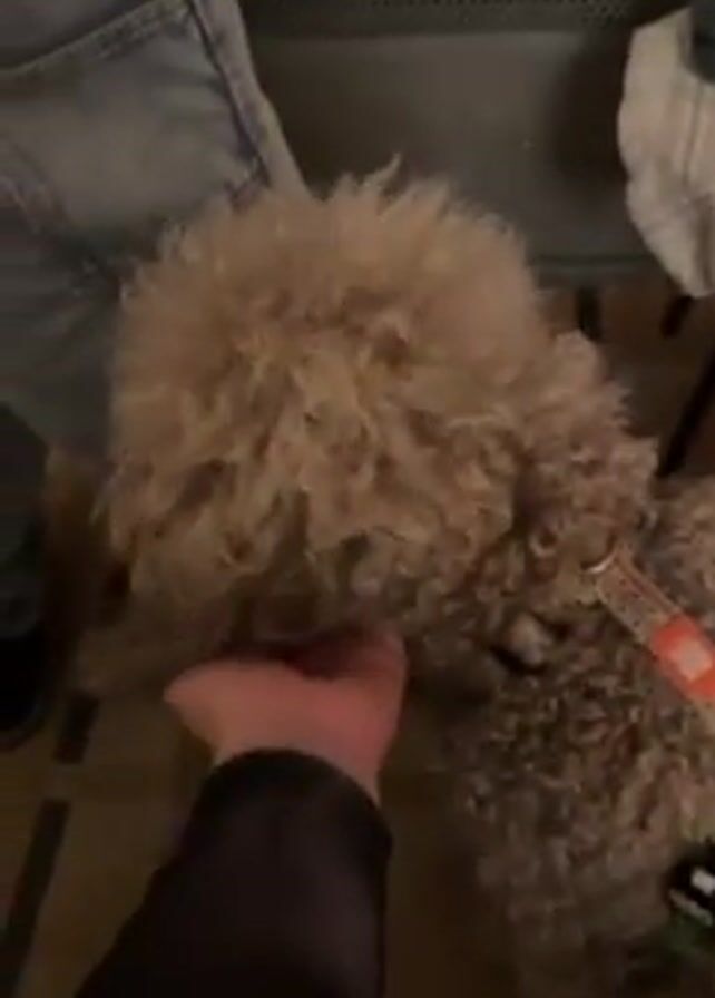person petting a dog with shaggy, light brown fur