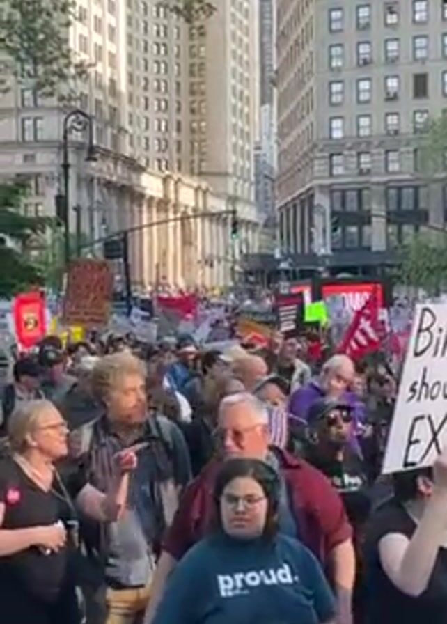 large crowd of people marching down a city street, holding signs and flags. Tall buildings line the street on either side, and trees are visible along the sidewalks. The crowd appears to be participating in a protest or demonstration. Many of the people carry signs with varied writings, and American flags can also be seen in the crowd. The atmosphere seems energetic but orderly, with people moving together in a unified direction.