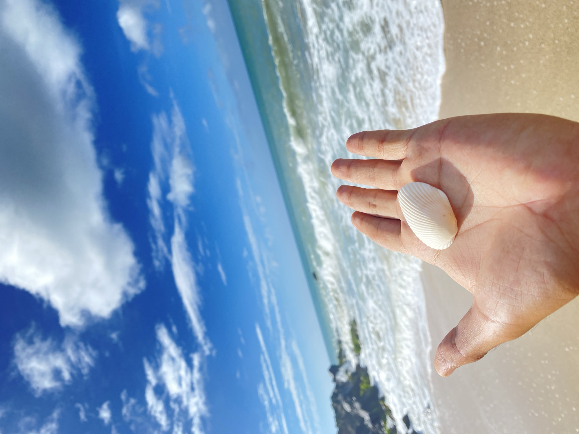 A person holds a white seashell in their right hand against a backdrop of a coastal scene
