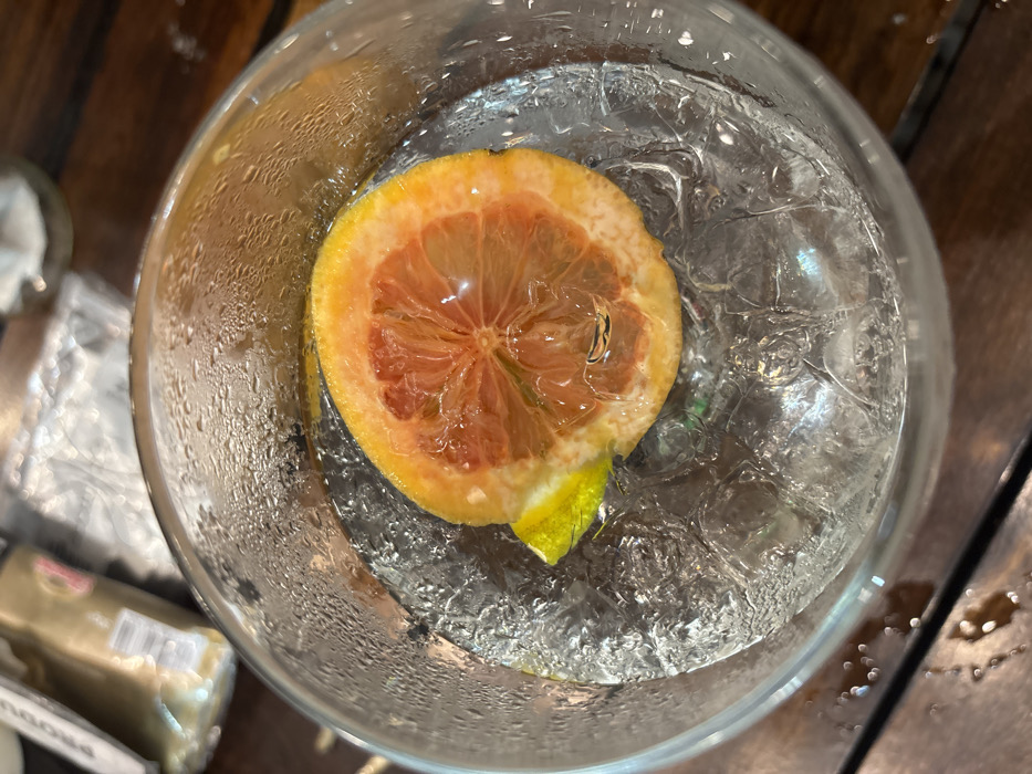 A top-down view shows a clear glass filled with ice and liquid. A slice of lemon, primarily orange in color with a touch of yellow rind, sits atop the ice. Condensation droplets cling to the outside of the glass. Portions of packaging and utensils are visible on the wooden surface surrounding the glass.