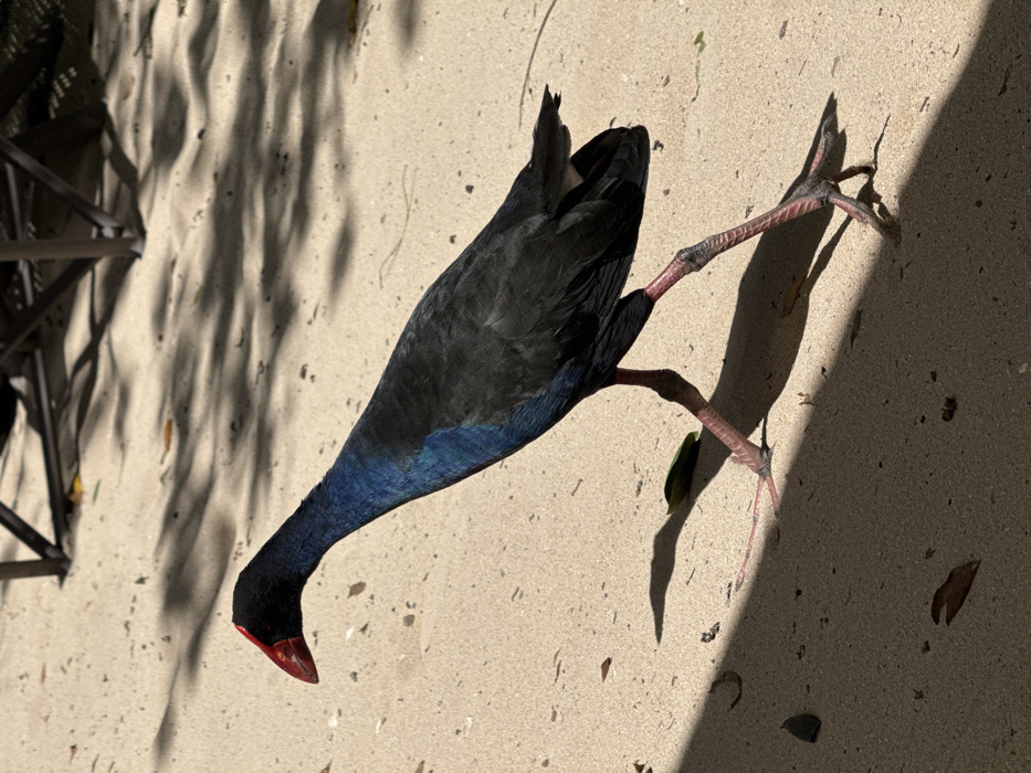 - "A Pukeko (Purple Swamphen) is depicted in profile, striding leftward across a sunlit sandy surface in Bourail, New Caledonia, France" by FM-BCfsB2, licensed under CC BY 4.0