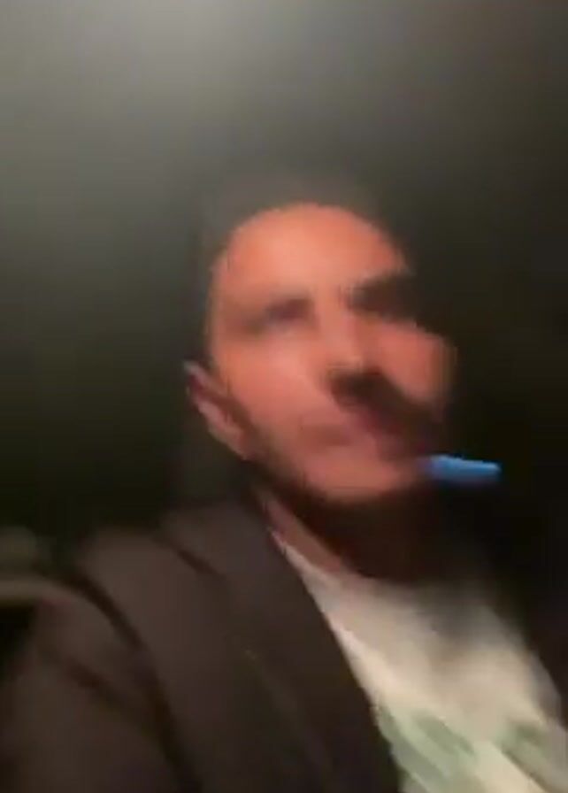 A young man is in a car. He is wearing a white t-shirt with a green design, and a black suit jacket. The car interior is mostly dark, except for a light near the ceiling. The man speaks in the video.